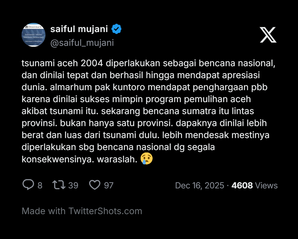 Repelita Jakarta - Pengguna akun @saiful_mujani pada 16 Desember 2025 menyampaikan perbandingan antara penanganan tsunami Aceh tahun 2004 dengan bencana banjir serta longsor di Sumatera saat ini.