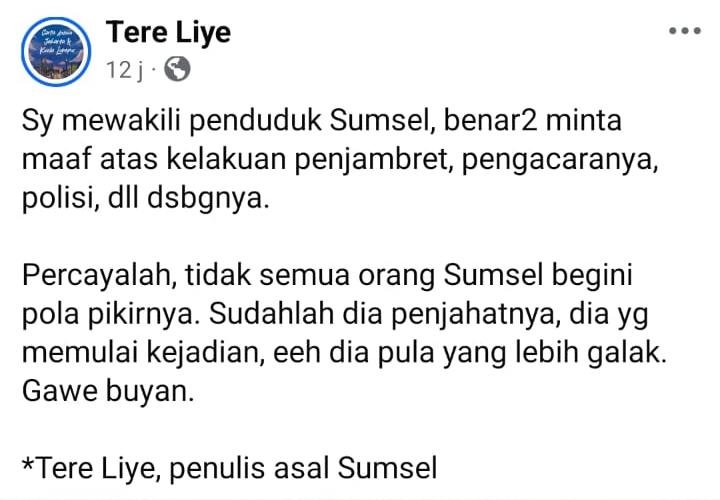 Tere Liye secara tegas menyampaikan permintaan maaf atas nama penduduk Sumatera Selatan terkait tindakan pelaku penjambretan beserta pihak-pihak yang terlibat seperti pengacara dan aparat penegak hukum.