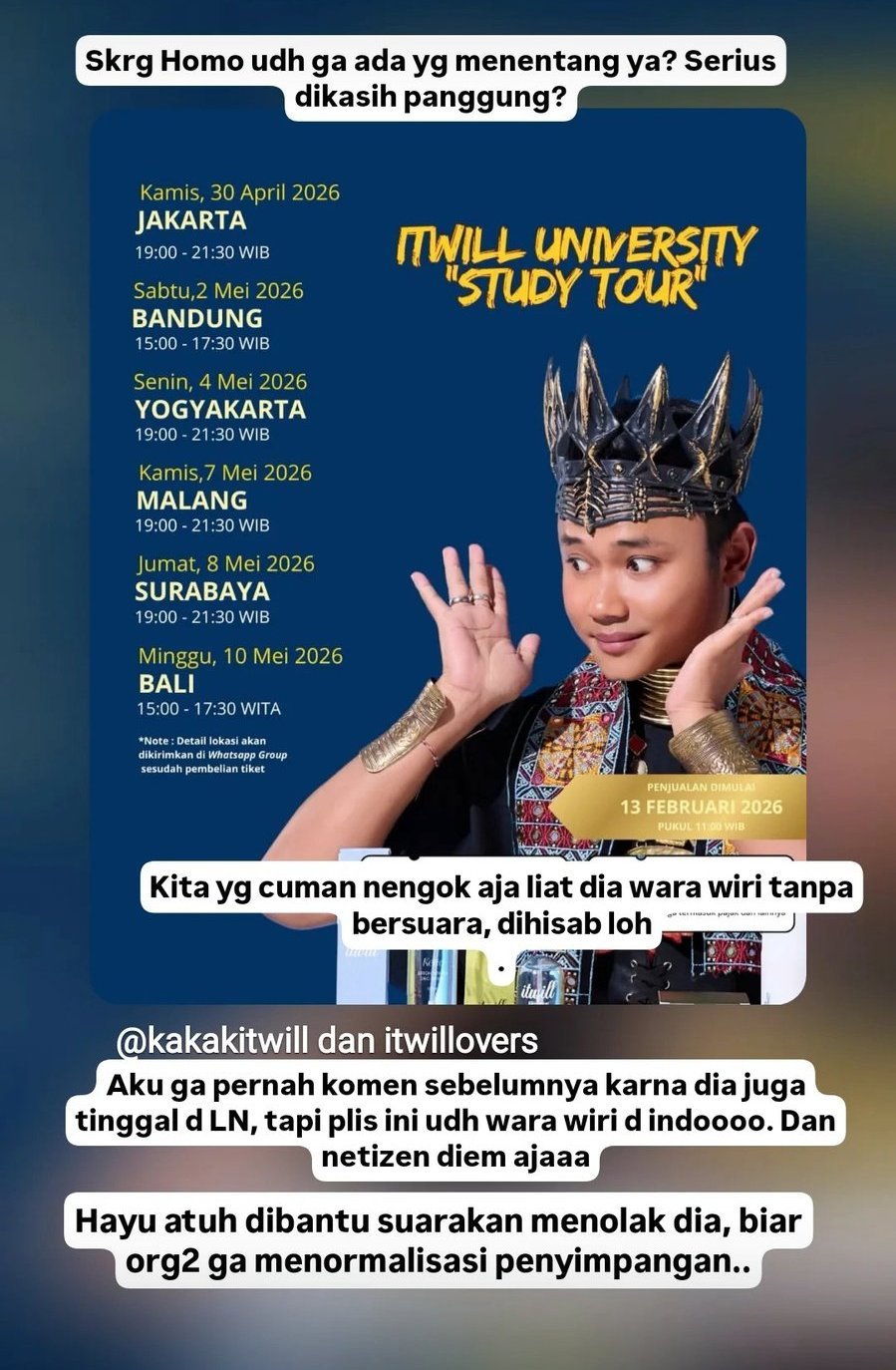 Kecaman tersebut muncul sehubungan dengan jadwal acara Itwill yang mencakup Jakarta Bandung Yogyakarta Malang Surabaya dan Bali pada akhir April hingga awal Mei dua ribu dua puluh enam dengan penjualan tiket telah dimulai sejak tiga belas Februari dua ribu dua puluh enam.